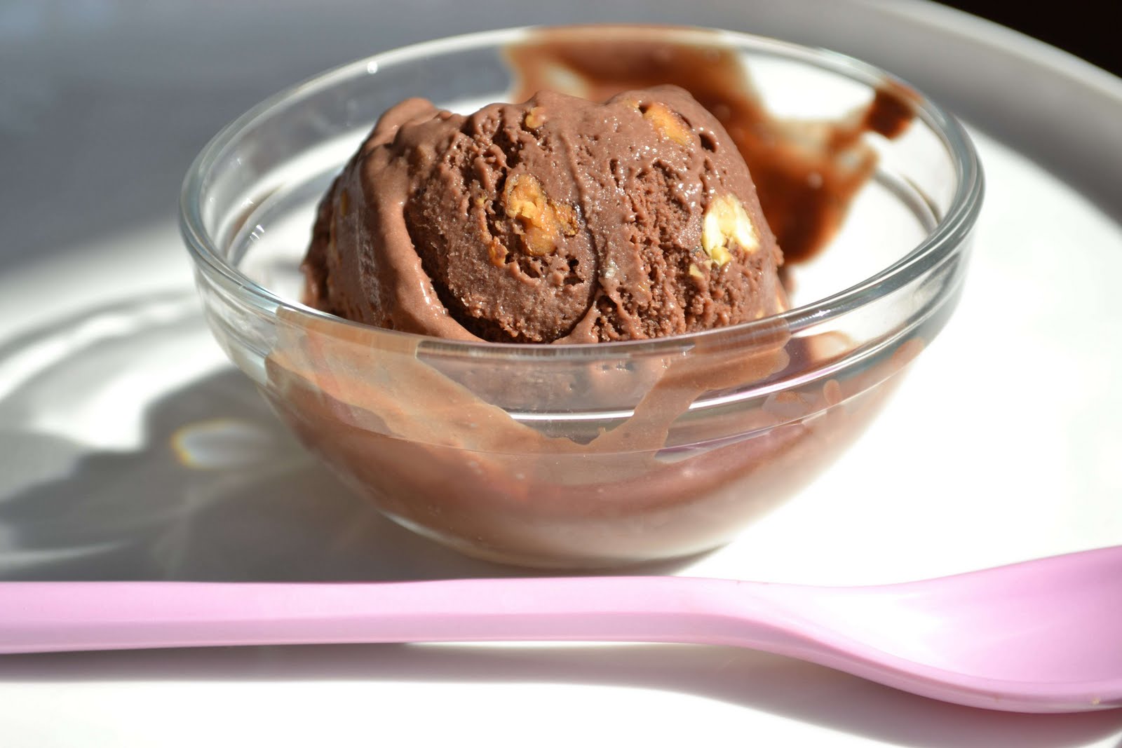 Inghetam compozitia in masina de inghetata apoi mancam fara mila. Noi am adaugat in compozitie si o mana de nuci prajite ca poate nu avea destule calorii. Pofta buna!