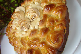 Cand cozonacelul a crescut,cu siropul in care a fiert coaja de portocala,l-am uns pe deasupra si pe biluta din mijloc am pus decorul din trandafiri.