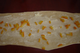 Jumatate din crema rezultata o intindem pe fasia de aluat,iar deasupra vom presara coaja de portocala confiata taiata marunt, dupa care rulam.