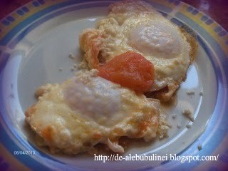 Feliile de rosie le pun in tigaie, cu putin ulei; le prajesc foarte putin pe o parte, dupa care le intorc, presar peste ele sare (nu prea multa deoarece eu folosesc branza sarata) si piper, apoi, cu grija, sparg ouale, in asa fel incat sa acopere feliile de rosie.