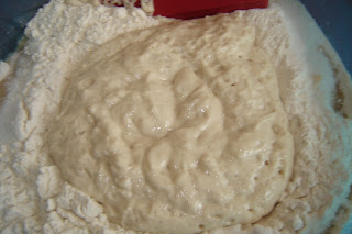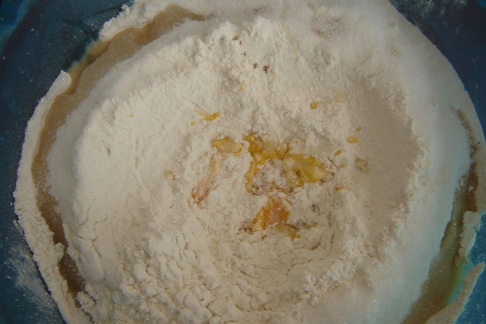 Intr-un bol cernem restul de faina,in care vom adauga praful de sare,uleiul si zaharul ramas.