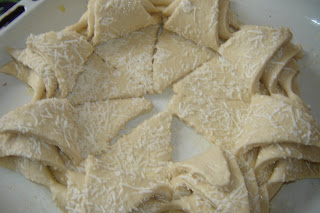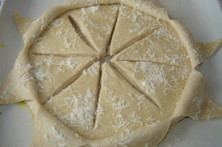 Teancul de foi il vom taia in 8 parti egale,incepand din mijloc,spre exterior,unde vom lasa o margine de cativa milimetri.