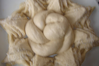 A cincea bila,o intindem intr-un rulou,pe care il vom impleti in doua.Il strangem si il vom aseza in mijlocul,ramas gol,la cele 4 foi.