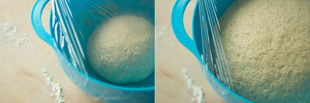 Am amestecat toate ingredientele in afara de seminte intr-un castron mare si le-am framantat cateva minute pana am putut sa desprind cu usurinta aluatul de pe maini. Am uns castronul cu ulei de masline, am pus aluatul inauntru si l-am acoperit cu folie de plastic apoi l-am lasat sa creasca linistit cam jumatate de ora.