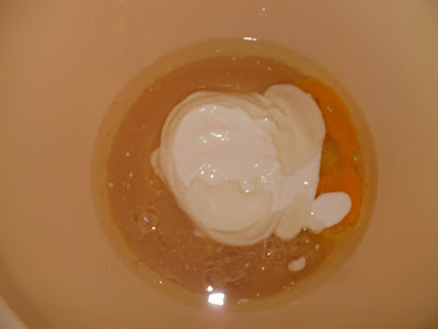 Se pune intr-un bol o cana de ulei, smantana si oul.