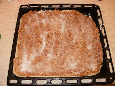 Inainte sa va apucati de pregatirea tavi aprindeti cuptorul . Se unge tava cu putin ulei si se tapeteaza cu faina sau puteti pune hartie de copt, se aseaza prima foaie de placinta ,se tapeteaza cu gris (ajuta foarte mult pentru ca absoarba zeama din mere care a mai ramas) , se adauga merele (merele daca mai au putina zeama sa incercati sa le mai stoarceti), se mai adauga iarasi gris , se pune si a doua foaie de placinta, se inteapa placinta cu furculita din loc in loc.