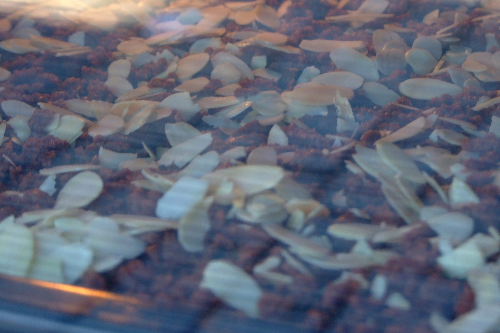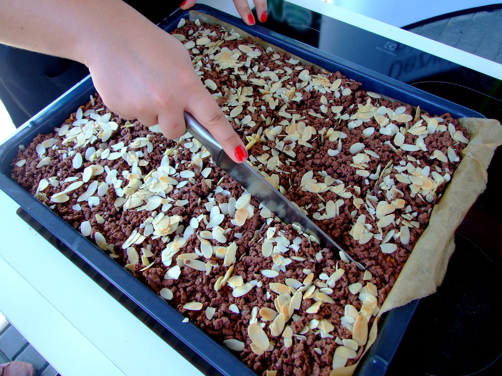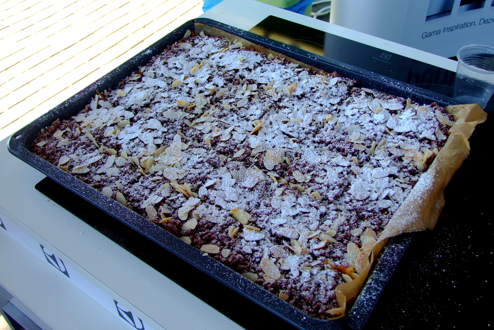Înainte să băg tava cu prăjitura la cuptor am împrăștiat pe deasupra fulgi de migdale.