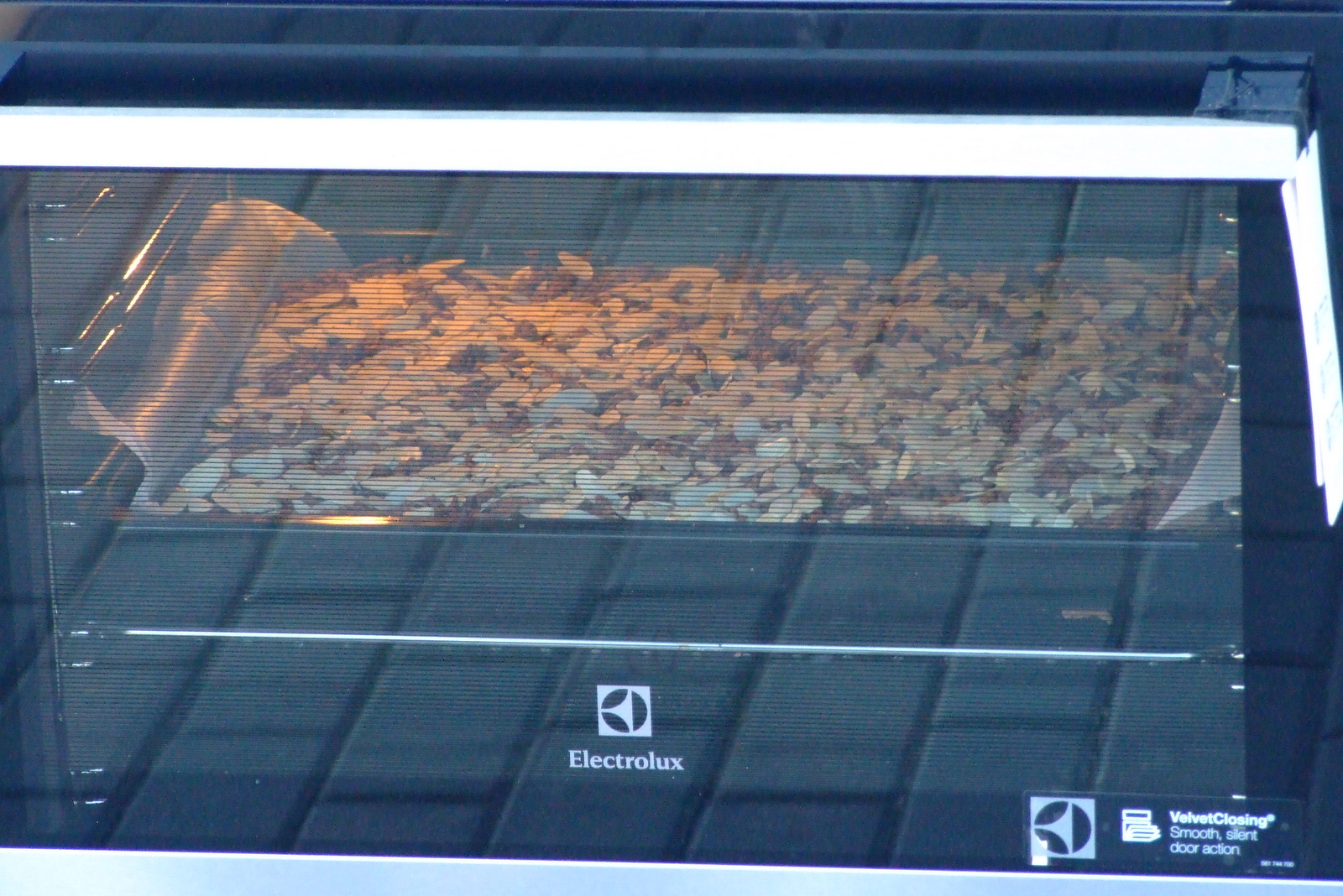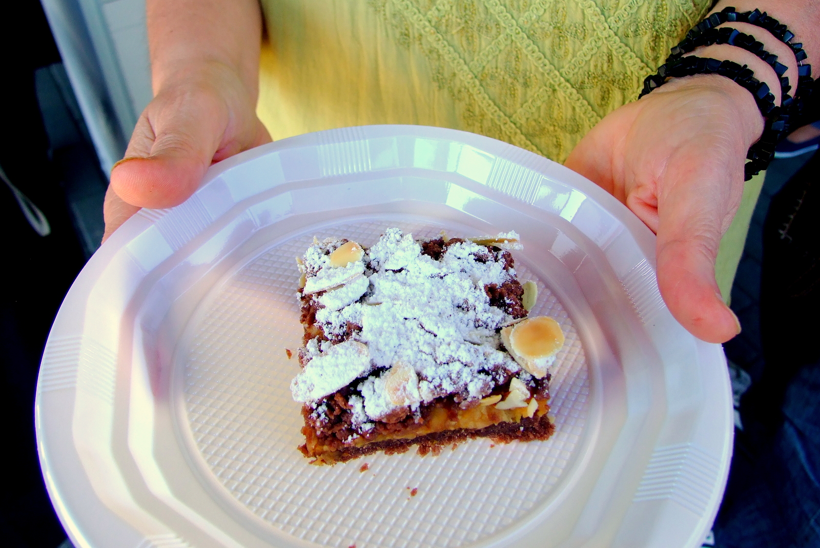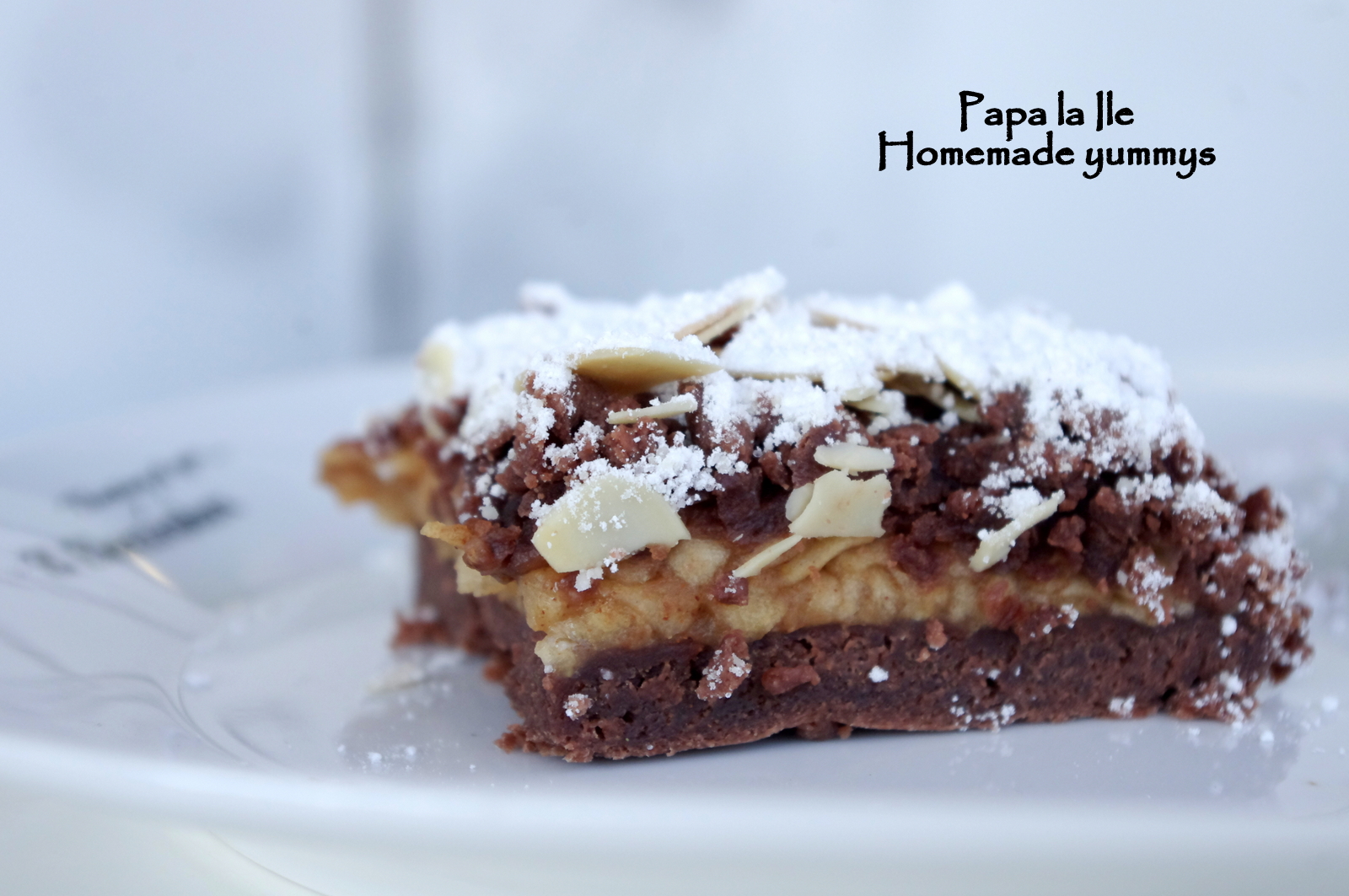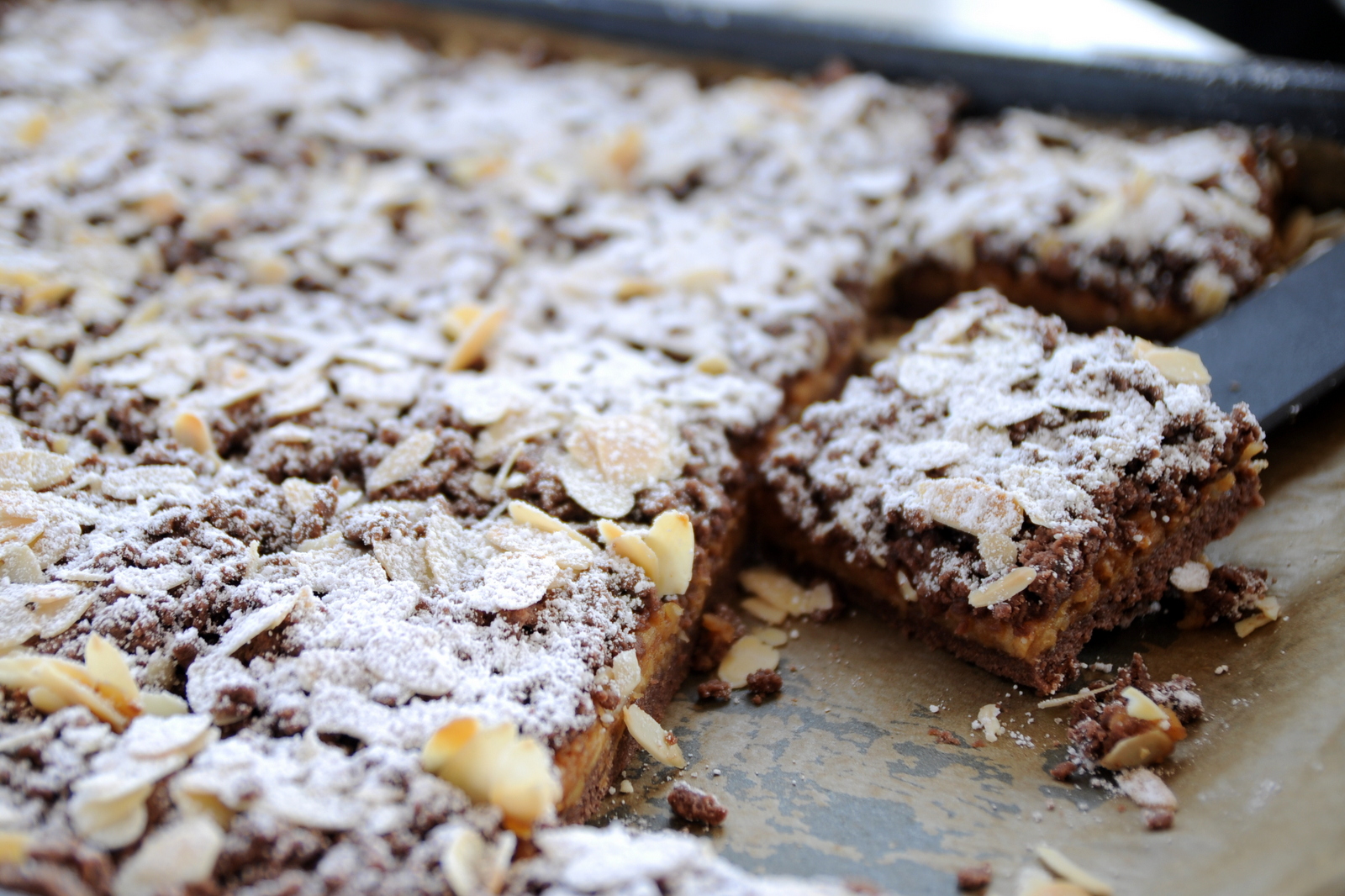 Înainte să băg tava cu prăjitura la cuptor am împrăștiat pe deasupra fulgi de migdale.