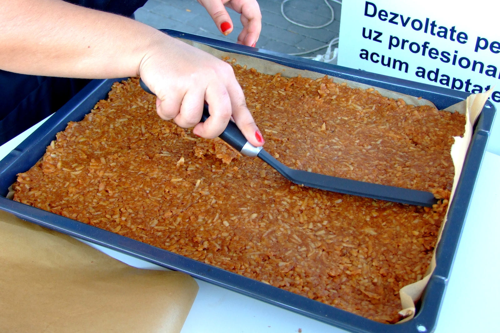 Înainte să trec la rețetă vă mai zic că pozele sunt de la cooking show și că deși în poze se văd niște tăvi mari eu vă dau ingredientele pentru o tava mai mică de 20 cm x 30 cm.