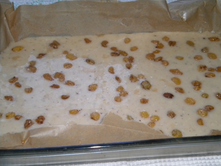 care se pune in tava tapetata cu hartie de copt. Avand o tava mica, am folosit un pahar de 200 ml pentru masurarea ingredientelor. Pe deasupra am rasfirat stafidele, pe care eu le tin intr-un borcan cu rom.