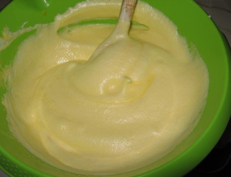 Separăm ouăle şi batem spumă albuşul împreună cu 2 linguri de zahăr. Gălbenuşurile se freacă bine cu 3 linguri de zahăr până îşi dublează volumul şi devine o cremă spumoasă. Apoi adăugăm albuşurile bătute spumă şi amestecăm de sus în jos ca să nu cadă albuşurile. Adăugăm apoi cele 5 linguri de făină şi esenţa de vanilie, amestecăm bine pentru omogenizare, punem totul într-o cratiţă tapetată cu margarină şi făină şi dăm totul la cuptor pentru 30 de minute la foc mijlociu.