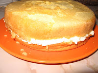 Când blatul e rece îl tăiem în două, îl însiropăm şi îl umplem cu crema dorită. Eu am făcut o cremă de vanilie de la dr. Oetker. Am bătut cu mixerul 250 ml de lapte cu 3 linguri de zahăr pudră şi cu plicul de cremă respectiv...3 minute şi gata!...