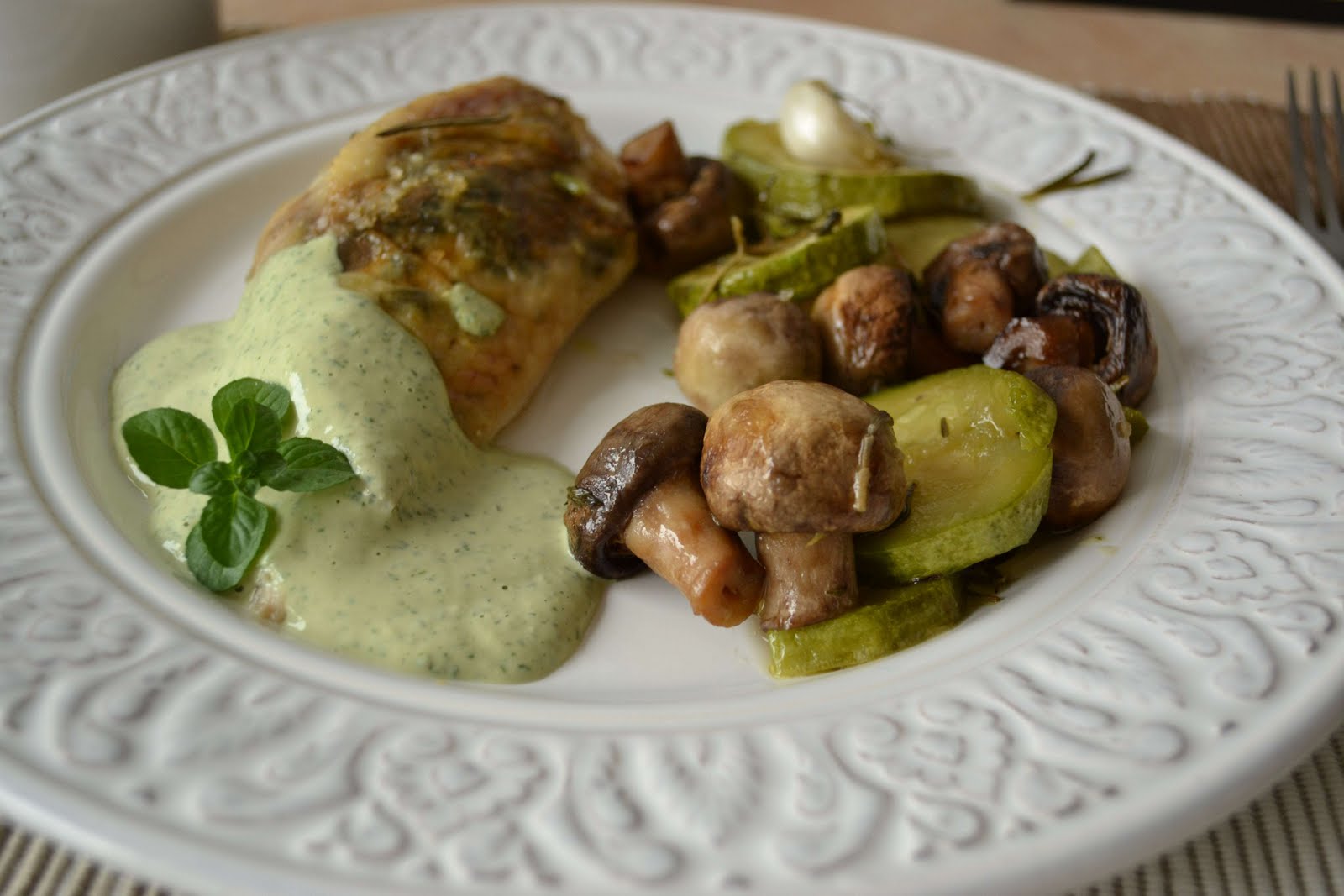 Am introdus pasta asta pe sub pielea puiului, incercand sa o distribui cat mai omogen. Am pus puiul in tava, am adaugat pe langa el un dovlecel taiat rondele si cateva ciuperci mici intregi, am presarat o mana de sare de mare grunjoasa, am mai rupt cateva fire de verzituri si am stropit cu ulei de masline.