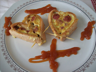 Într-o tigaie se topeşte puţin unt şi se pun inimioarele de crenvuşti. Oul se bate cu un praf de sare şi se toarnă în interiorul inimilor.