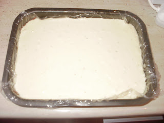 Se lasa la rece si se prepara intre timp ciocolata alba, din ingredientele ramase, in acelasi mod ca si cea neagra. Cand este gata, se toarna in tava