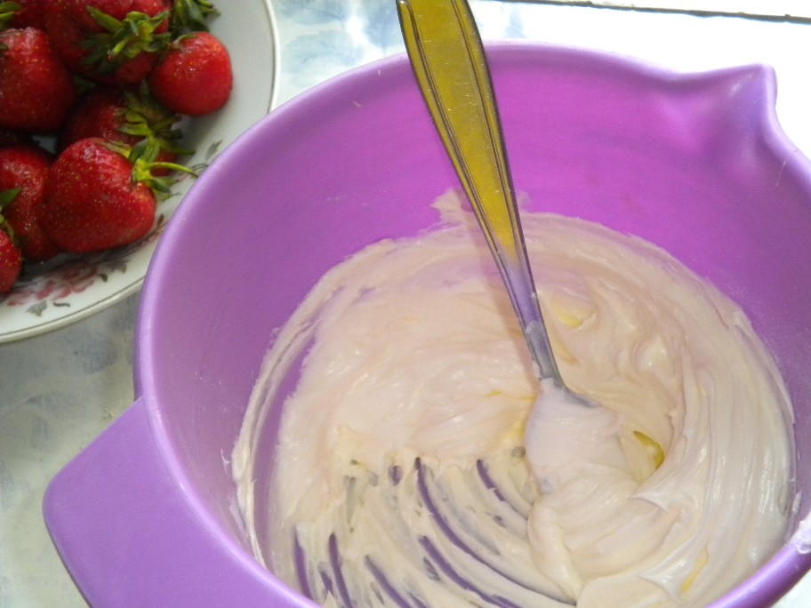 Am scos cca o treime din frisca si am pus-o deoparte. Restul de frisca am incorporat-o in unt apoi am zdrobit 8 capsune cu furculita pana cand s-au maruntit bine, si le-am incorporat in crema.