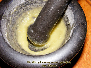 Intre timp, curatam usturoiul apoi il punem in mojar si il pisam bine adaugind un virf de cutit de sare si doua linguri de ulei, rezultind o crema legata.