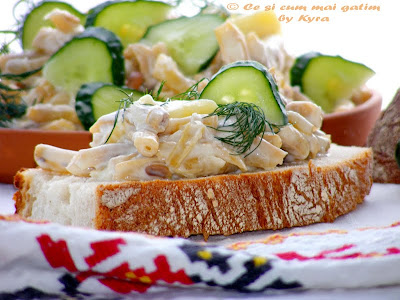 Mai pe scurt, am inlocuit mujdeiul de usturoi simplu cu o maioneza cu usturoi, transformind-o intr-un aperitiv apreciat.