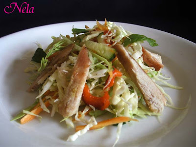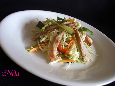 Toate legumele se taie fideluta .Pieptul de pui se prajeste si se taie fasii.Se amesteca legumele cu pieptul si se pune dressing-ul peste.