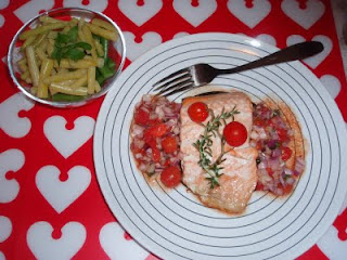 5.Aseazati pe farfurii o bucata de somon, pe care-l decorati/ acoperiti cu salata cu rosii.Serviti imediat.