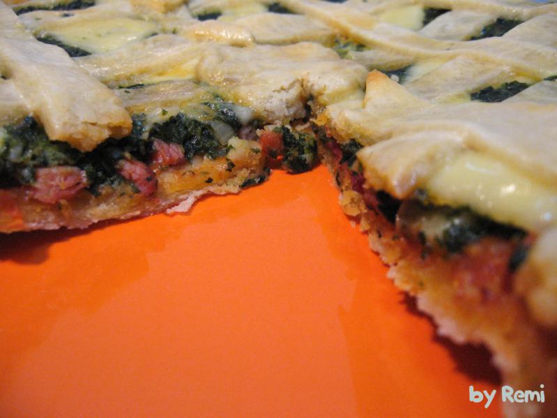 După ce au trecut cele 10 minute am pus în cocă umplutura în felul următor: un strat din carnea cu sos, un strat de spanac, feliile de brânză topită rupte în cîteva bucăţi. Apoi am pus deasupra lor grilajul făcut din aluatul rămas, am uns totul cu un ou şi am dat la cuptor pentru vreo 20-25 minute.