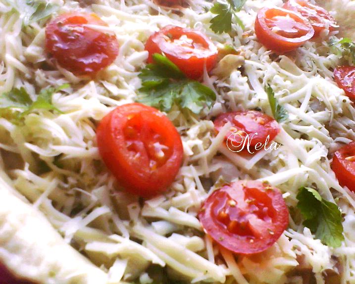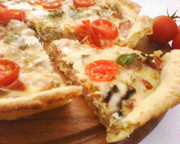 Aluatul se intinde in forma de tarta ,se inteapa cu o furculita si se adauga umplutura ,peste umplutura se pune cascaval ras se orneaza cu o rosie taiata felii si cu patrunjel.Se coace la 180 de grade.