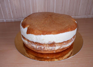 + inca o crema fff subtire de ciocolata care sa fie maro tot de la cuburi cu lapte... ca de, desi trebuia numai alb, nu m-a rabdat inima sa nu pun putina crema de ciocolata cu lapte...