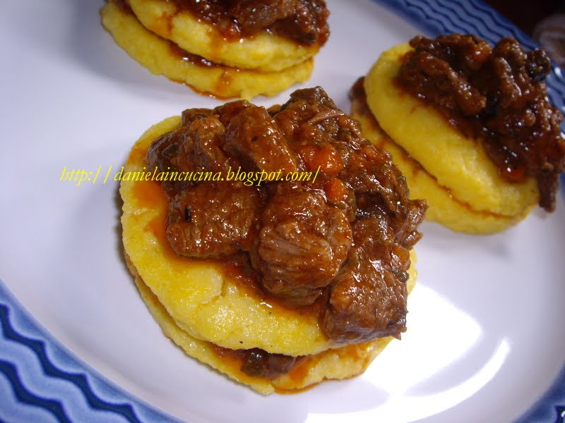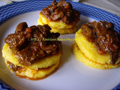 le-am asezat pe platou, am pus un pic de sos de la carnita, apoi inca un cerc de mamaliguta si am acoperit cu sosul cu tot cu carne.
