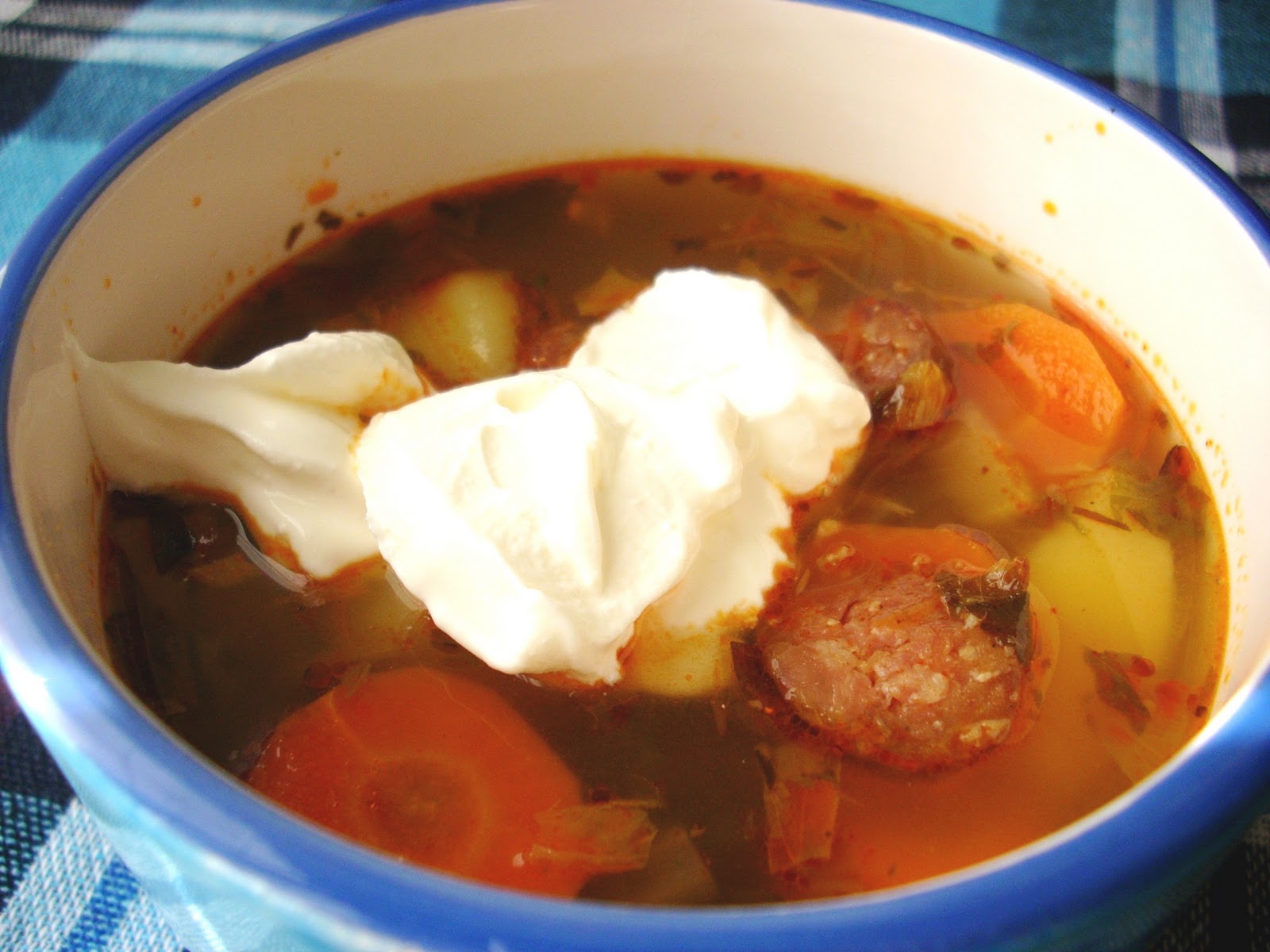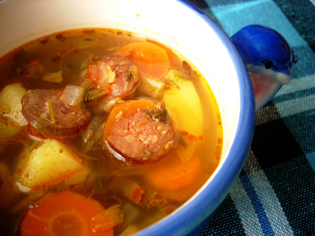 Zeama de cartofi cu afumatura e una dintre preferatele mele. Imi place sa fie mai bogata, cu multe legume si carne, cu cartofii usor sfaramiciosi, deci fierti ceva mai mult decat ar trebui. Asa imi place mie, nu trebuie sa faceti ca mine :). La zeama asta am folosit cartofi taiati cuburi, ceapa, ardei si apio tocate, dar nu foarte marunt; morcov taiat felii si usturoi ras pe razatoarea mica. Am calit carnatii feliati in oala incinsa cu foarte putin ulei. S-au rumenit rapid, am pus peste ei toate legumele si am lasat la innabusit, la foc mic. Am condimentat cu boia, ceva mai multa de data asta, piper si sare. Odata inmuiate legumele, am acoperit cu apa si-am lasat sa fiarba incet. Am mai avut 2 foi de varza murata la congelator, le-am pus si pe ele, nu ca ar fi contat prea mult la gust. La zeama asta ar merge mai multa varza murata si zeama de varza pentru acrit. Eu n-am avut, asa ca am pus zeama de lamaie. Am aromat-o cu leustean uscat si putin tarhon, am pus si usturoiul ras, care-i important la mancarea asta si nu cumva sa lipseasca :)! De obicei nu procedez asa, insa acum am pasat cateva bucati de cartofi fierti, am amestecat cu lichid si-am incorporat in zeama. Nu s-a prea cunoscut, ca a fost cantitate mica de "ingrosala". Tot cu combinatia asta de ingrediente iasa un papricas misto de tot ;). Nu uitati de smantana si ardei iute :).